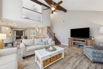 48 Full Sweep comfortably accommodates up to 6 guests. The master bedroom has a King bed, flat panel TV, a spacious private bathroom with double vanities ,walk-in shower, and direct access to the rear deck. Bedroom 2 has a King bed and private ensuite bath. The 3rd Bedroom has a comfy Queen bed and a full sized desk and work space, just in case you have to work a bit while you are here.