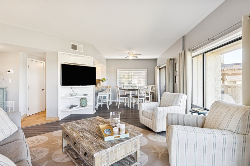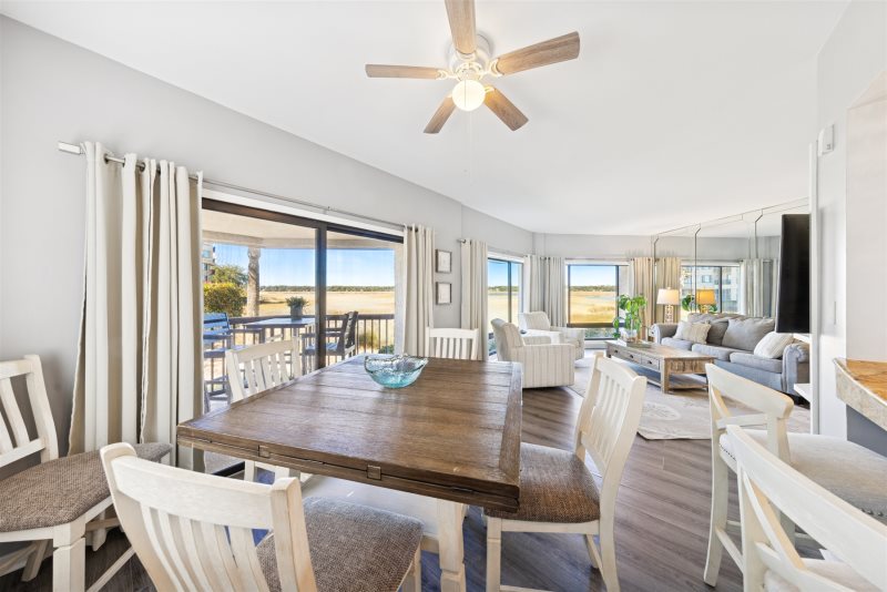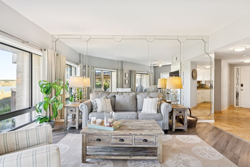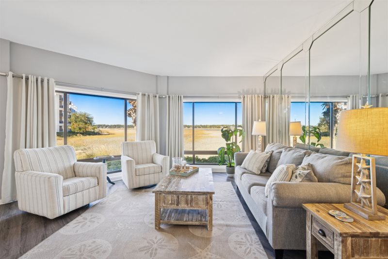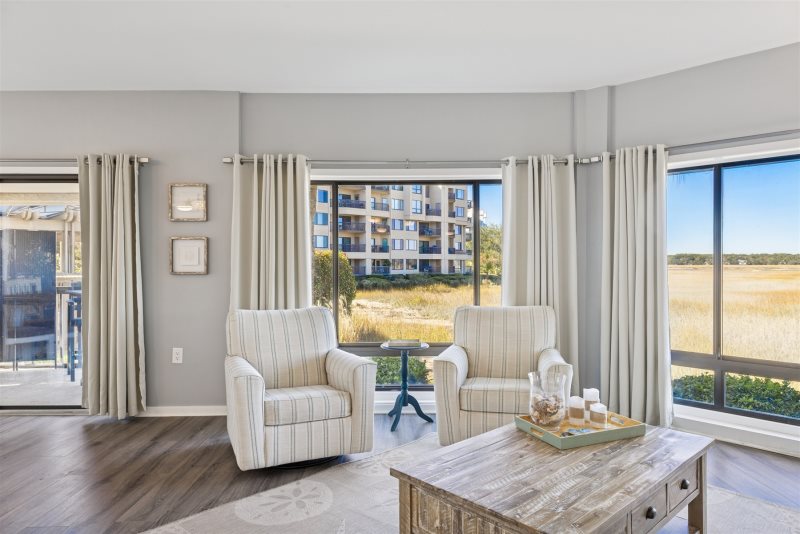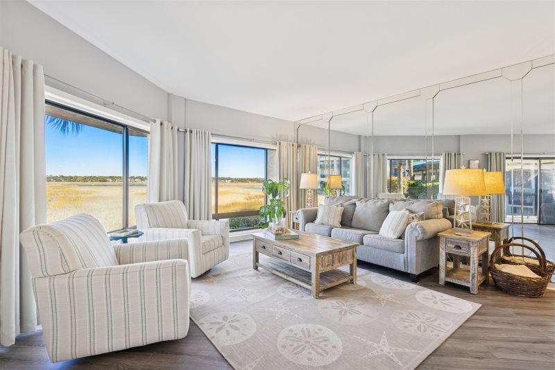 Escape to coastal comfort in this pet-friendly 2-bedroom, 2-bathroom 1st floor waterfront villa located in the highly desirable Captain’s Quarters at Shelter Cove on Hilton Head Island. With legendary Broad Creek views and a bright beachy-nautical style, this villa offers the perfect blend of relaxation and island adventure. Stylish living room with views that will brighten up anybody's day.